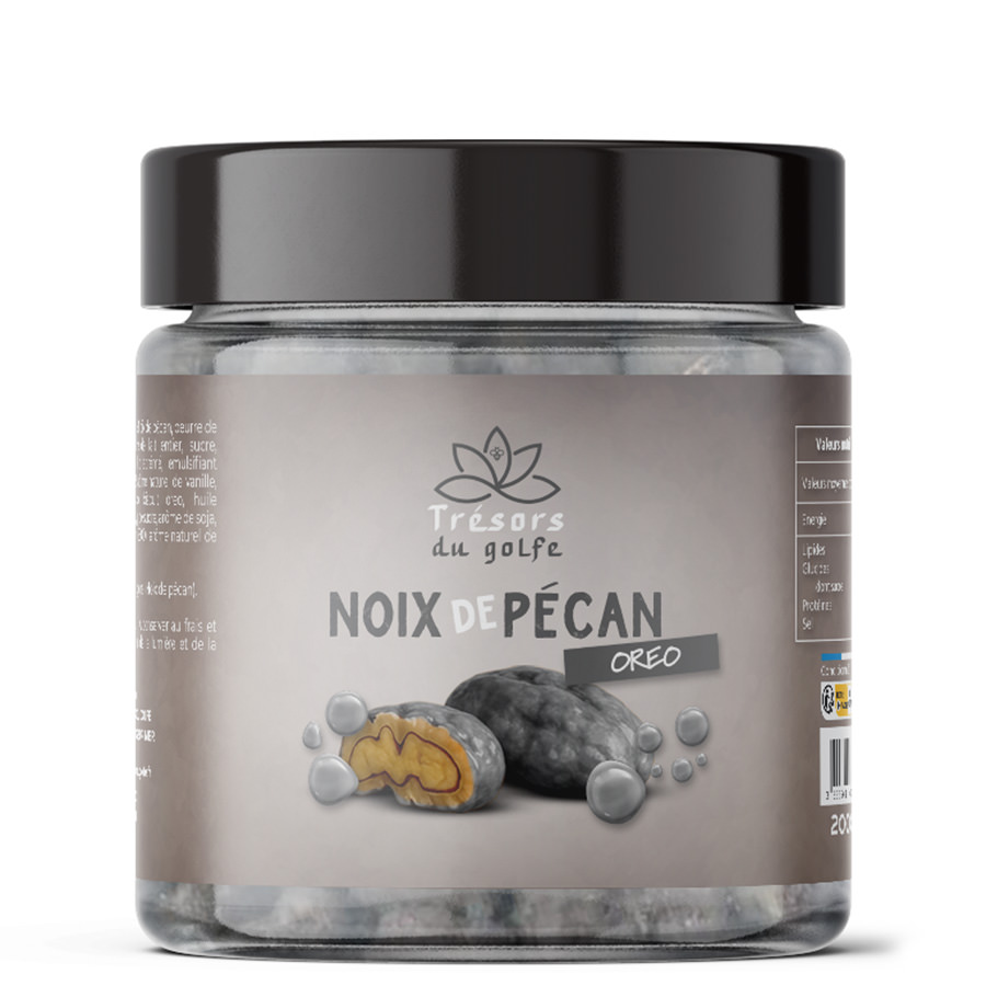 Boîte de 200gr de noix de pécan enrobées de DUBAÏ saveur Oreo.